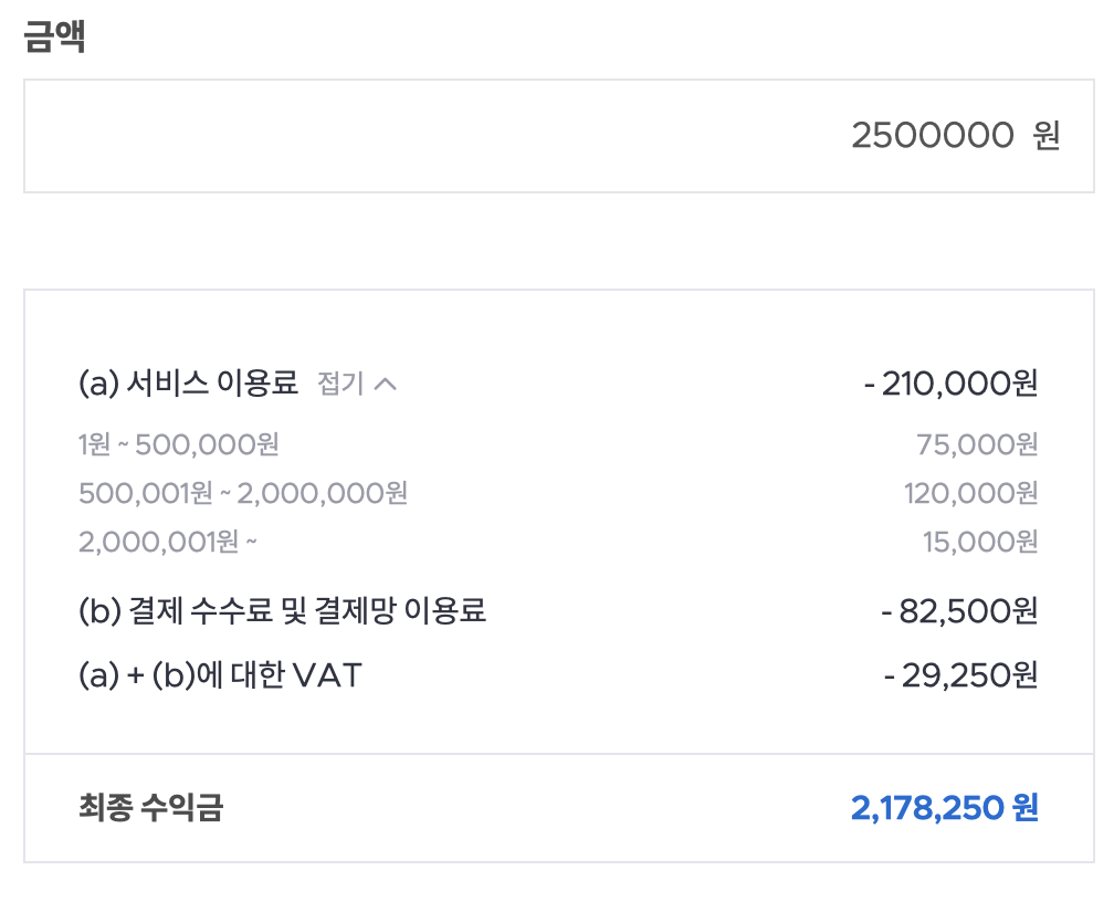 수수료는 총 324,750원으로 약 13% 정도가 된다. 금액이 커질수록 수수료는 낮아지긴 하지만 상당히 세다.