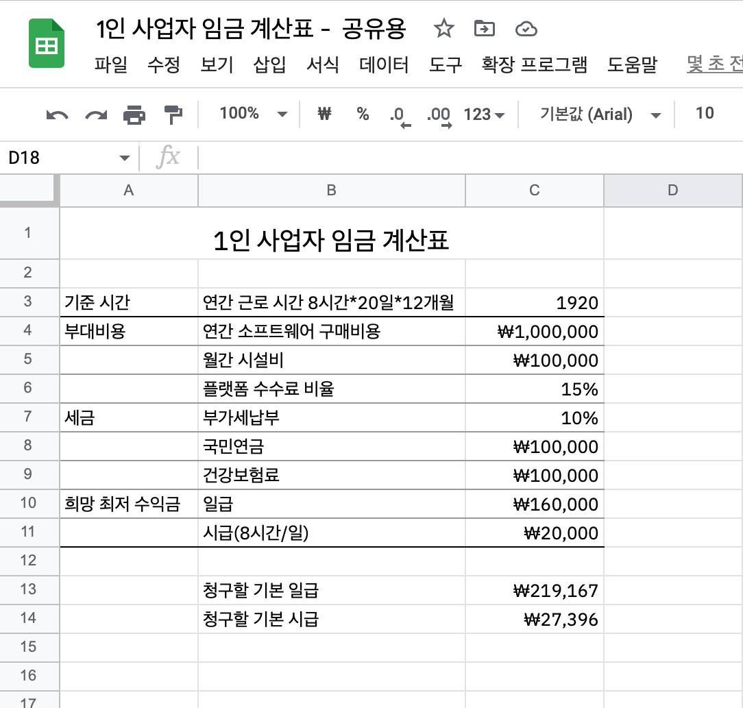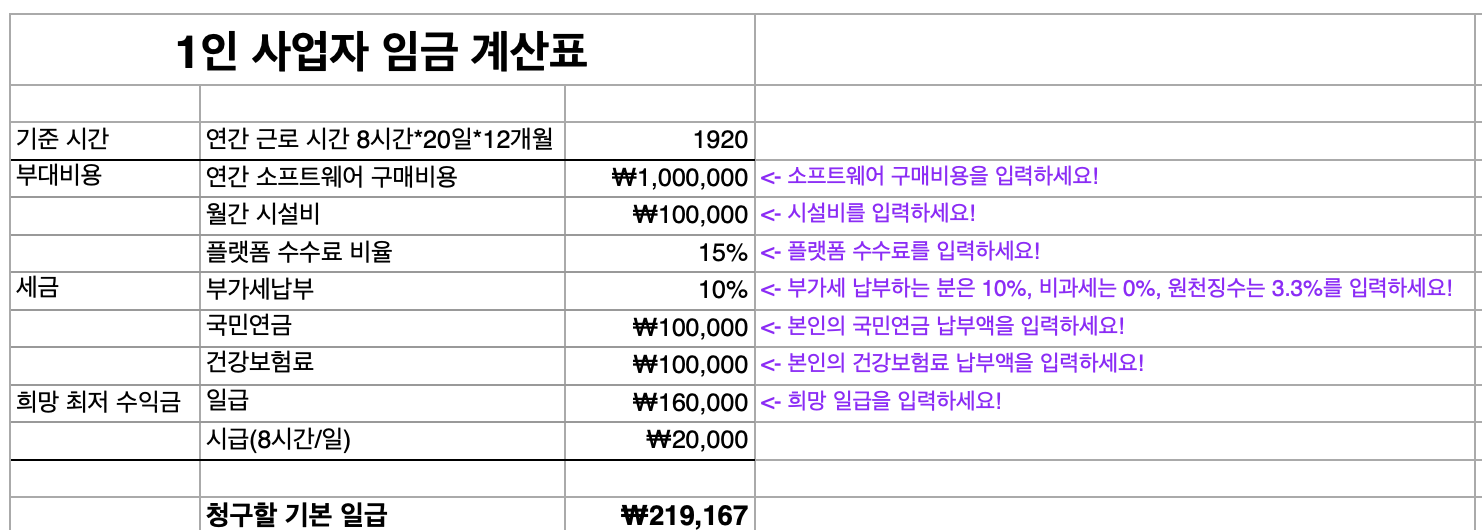 크몽 임금계산 1인 사업자 임금 계산표 기준 시간,연간 근로 시간 8시간*20일*12개월,1920 부대비용,연간 소프트웨어 구매비용,₩1,000,000,<- 소프트웨어 구매비용을 입력하세요! 월간 시설비,₩100,000