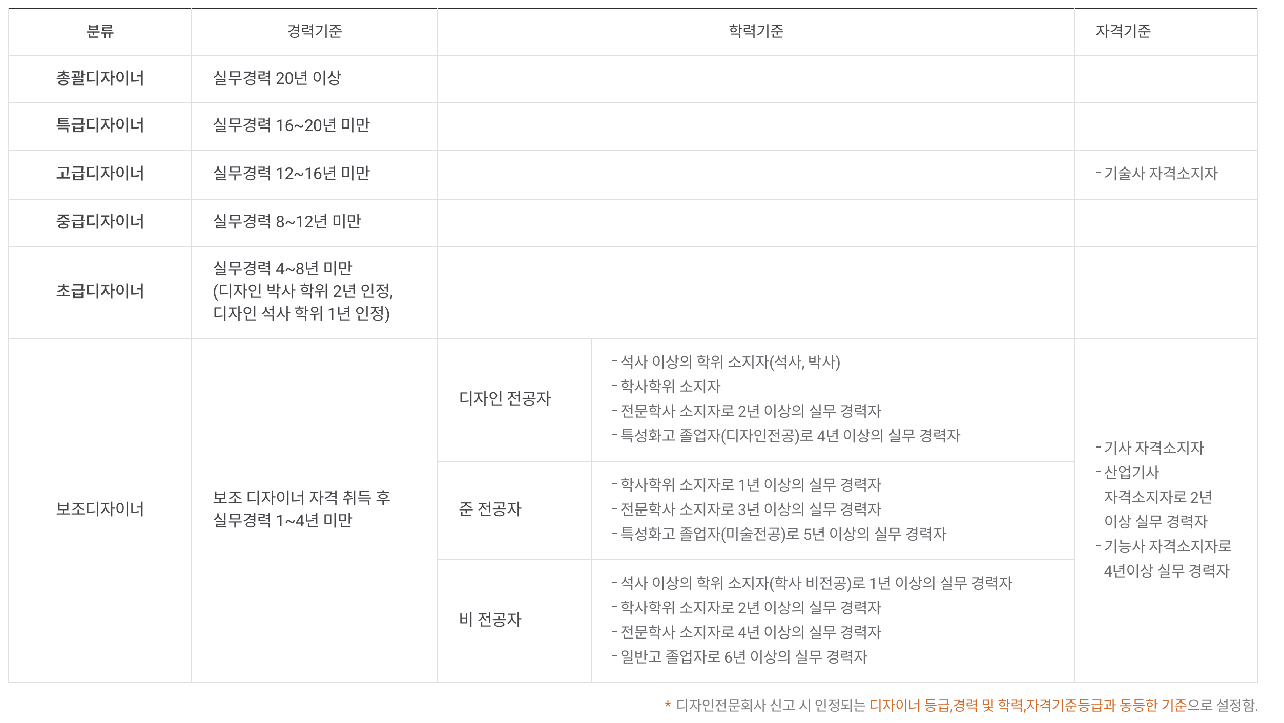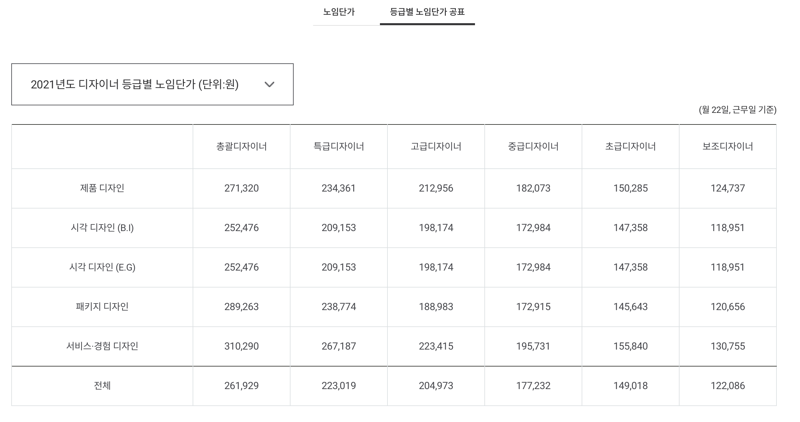 디자이너 노임 단가에 따르면 디자이너 등급은 총괄(20~년) > 특급(16~20년) > 고급(12~16년) > 중급(8~12년) > 초급(4~8년) > 보조(1~4년) 순으로 정의된다. 출처 : https://www.dsninfo.or.kr/cost/standard.do?type=PRICE&category=WAGE