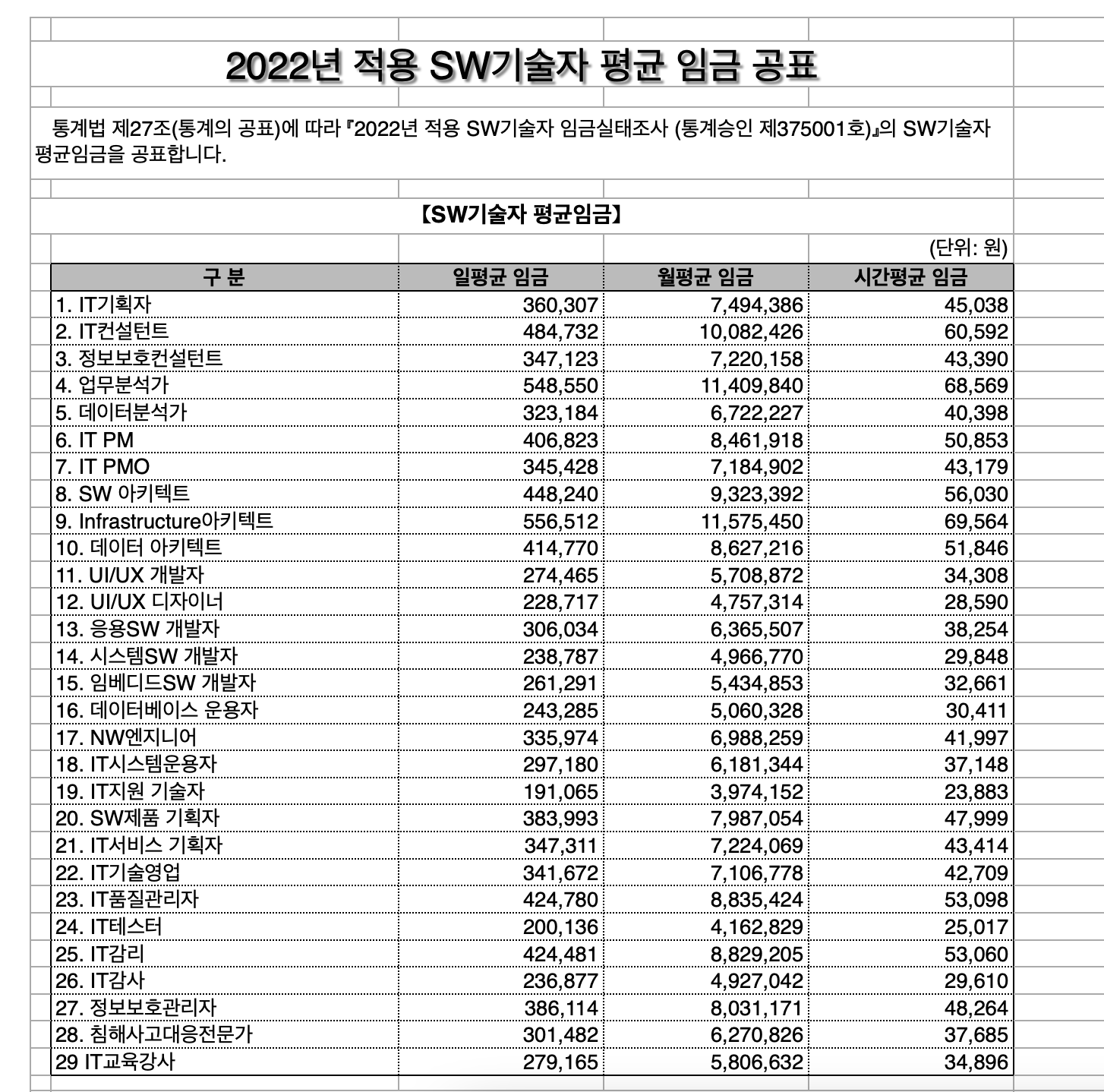 SW기술자 평균임금은 이렇다. 아마 수준별 구분은 하지 않아서 경력에 따라서 평균 아래로 받을지, 아니면 높게 받을지 생각해보면 될 것 같다.